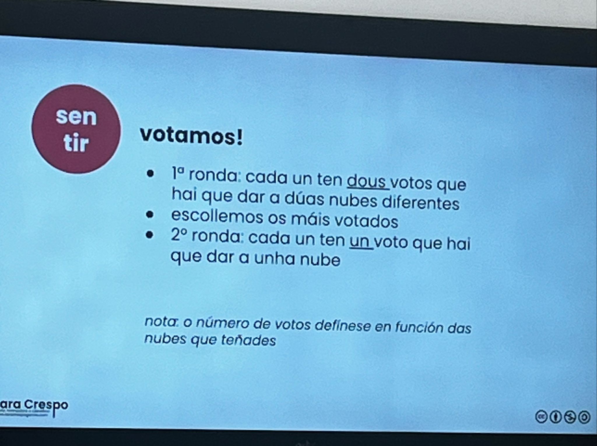 Selección e análise: Cada participante emite dous votos para escoller a nube máis representativa. A continuación, profundizamos na idea mediante saídas ou a recollida de información (a través de vídeos curtos, películas, etc.), intercambiamos o título da nube con outro grupo e propoñemos un reto concreto.