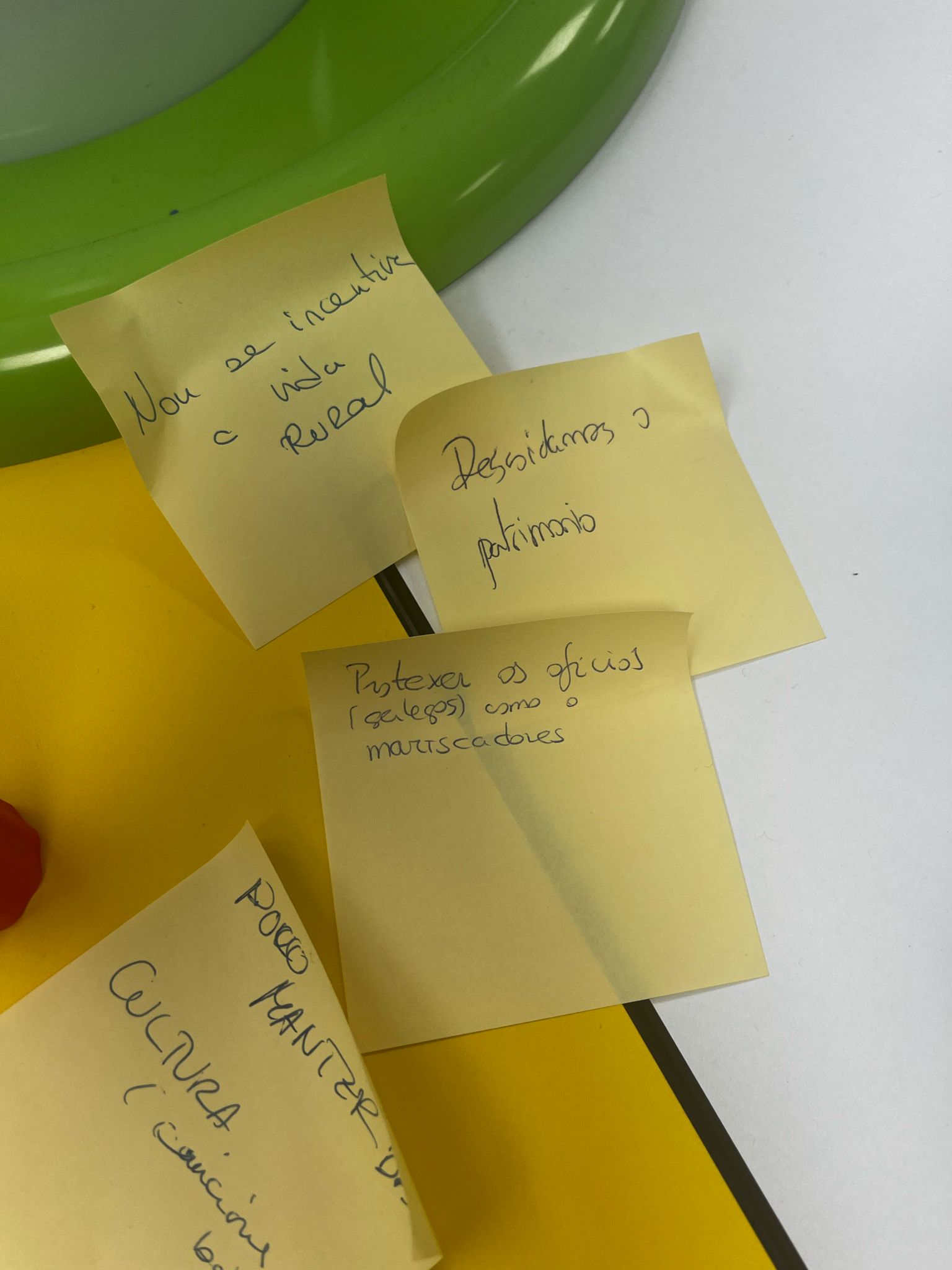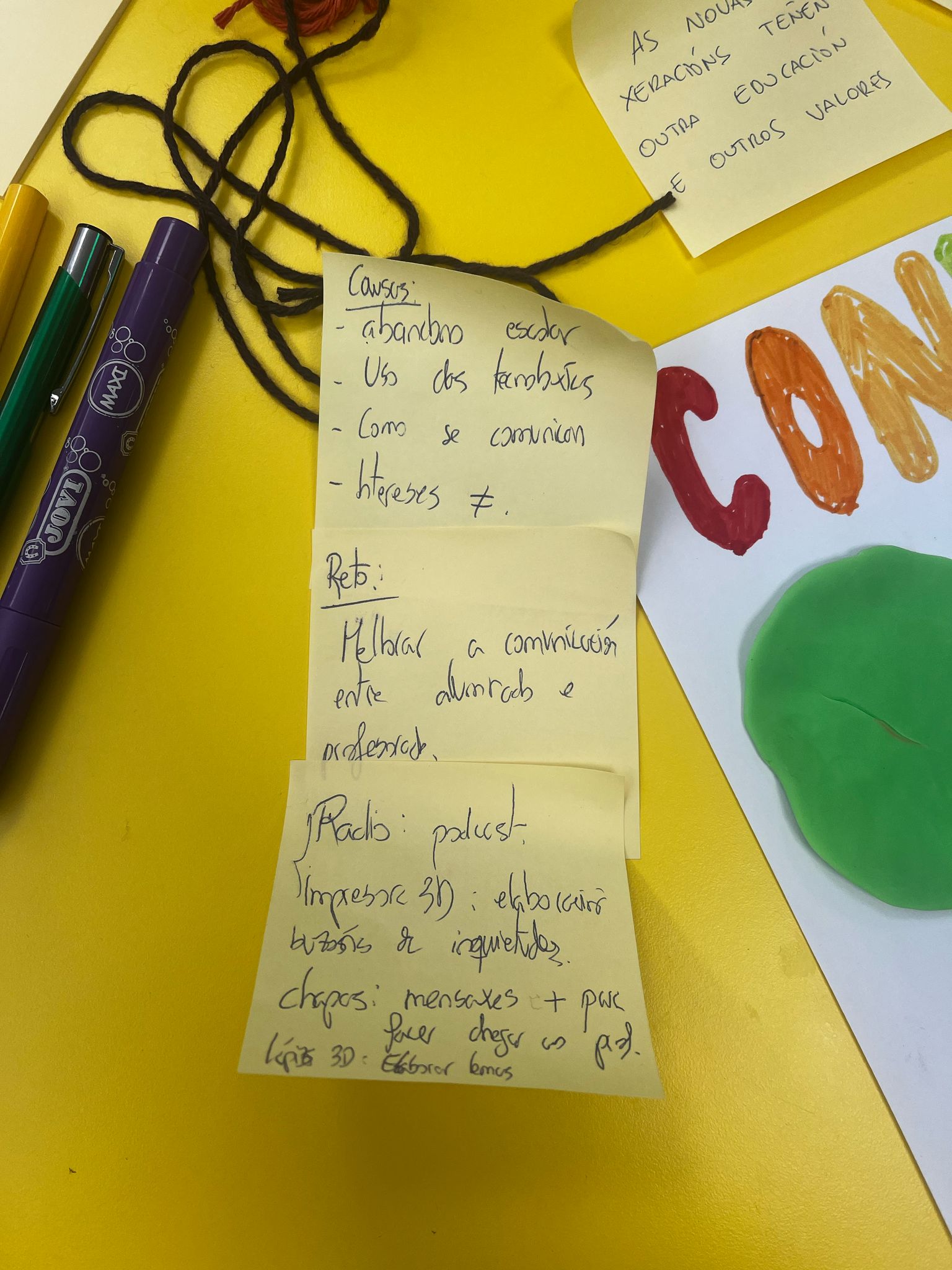 Organización das ideas: Transitamos do pensamento diverxente ao converxente agrupando as ideas en nubes temáticas. Cada nube debe conter polo menos dous post-its e un título claro (con suxeito e predicado) que permita identificar a idea nun primeiro vistazo.