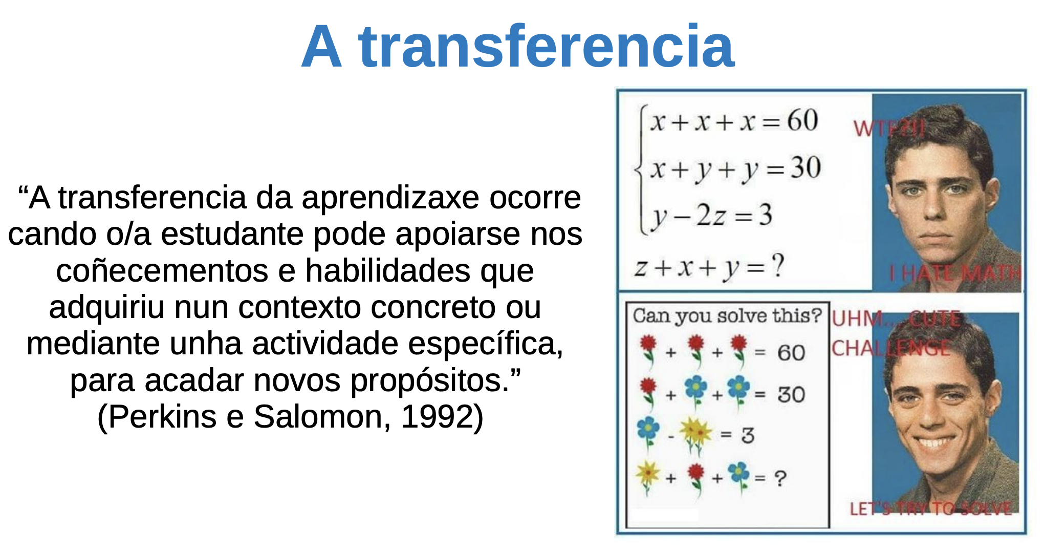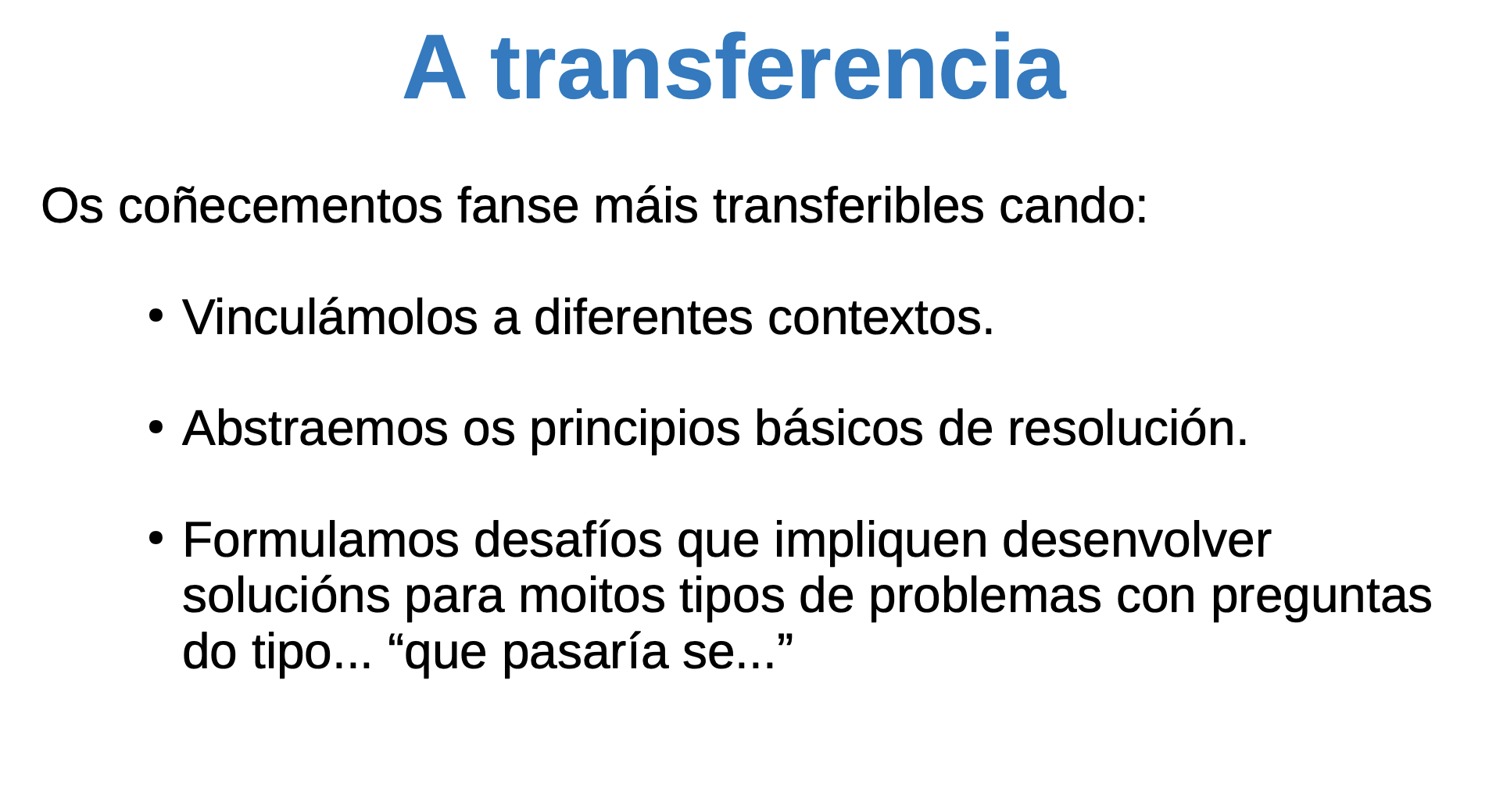 Existen outros exemplos de transferencia ou nas que sería preciso realizala ou conectalas. Por exemplo materias como Historia o Literatura deberían estar máis conectadas. Tamén se poden establecer similitudes entre acontecementos históricos pasados e actuais.