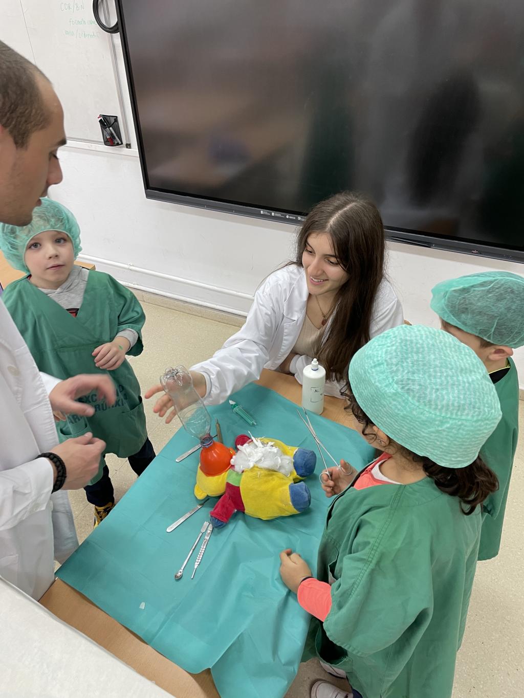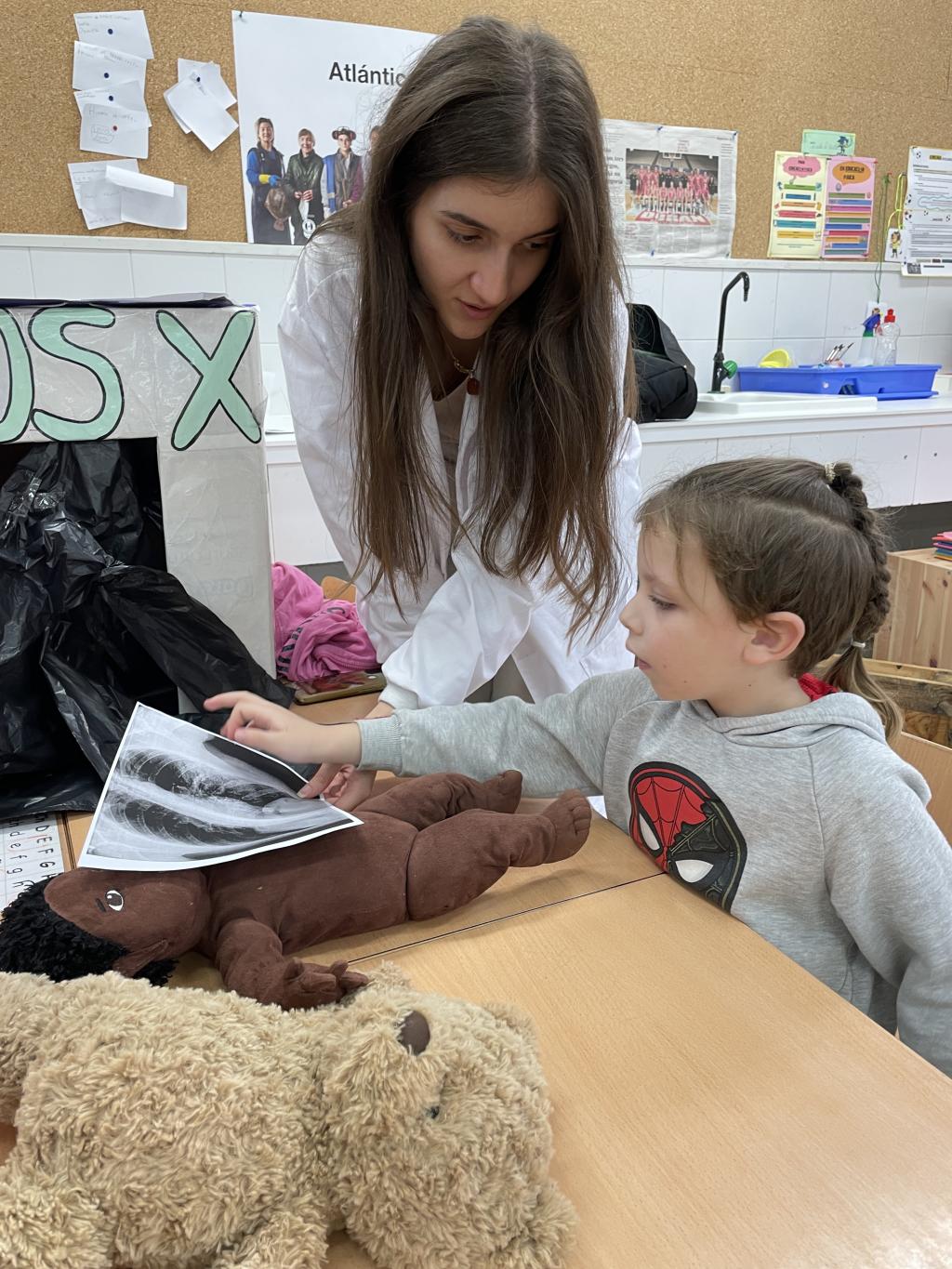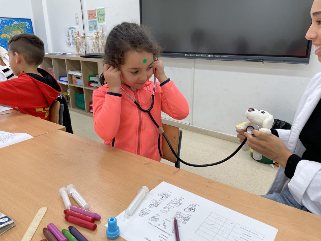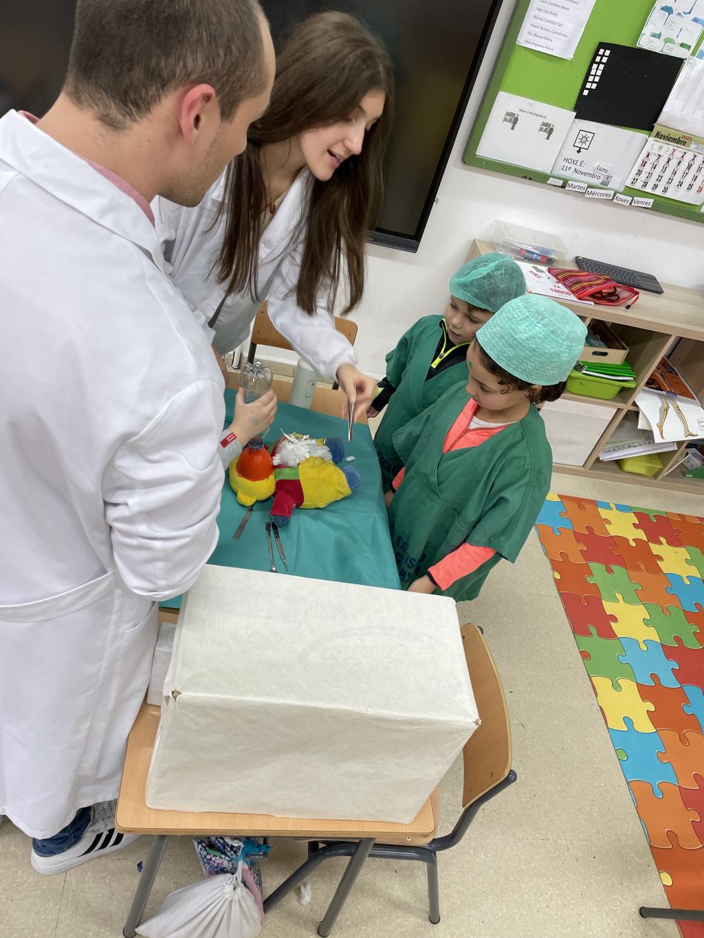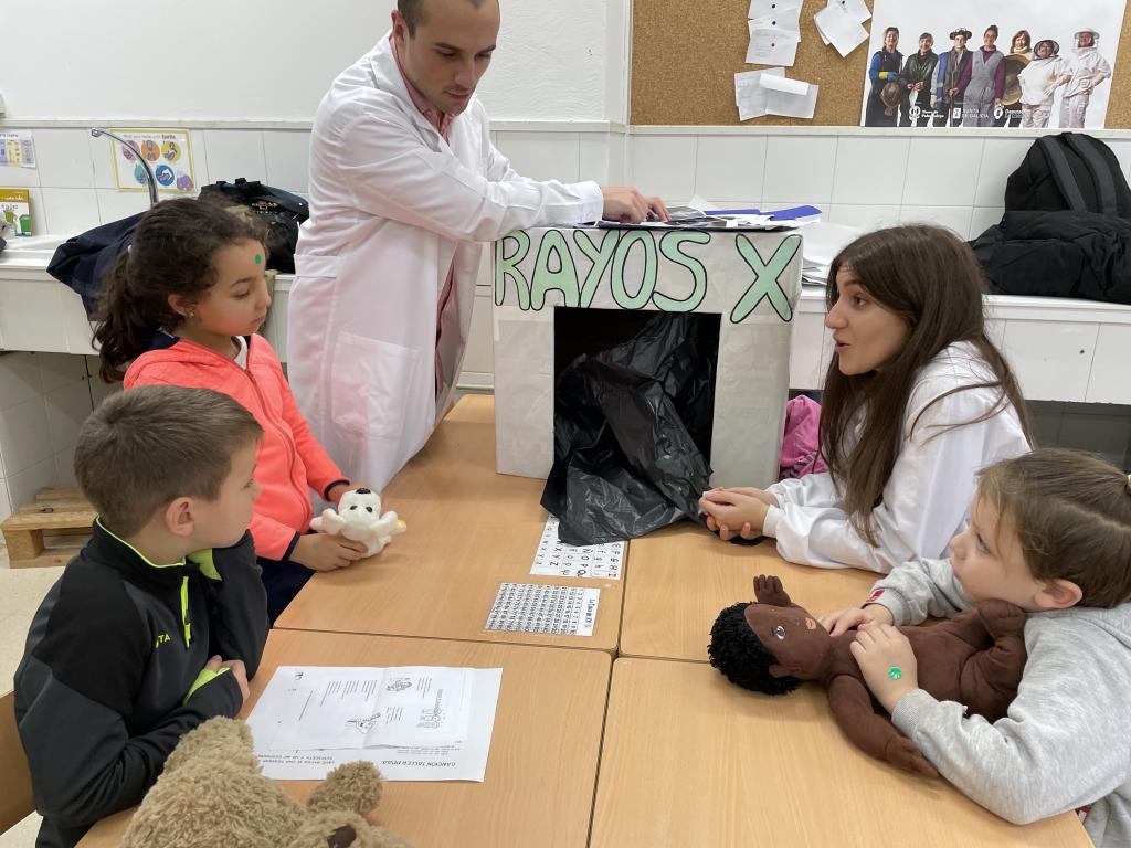 Un grupo de alumnado da USC, estudiantes de medicina, converteron algúns espazos do colexio nun centro de saúde co obxetivo de achegar a figura da médica as crianzas máis pequenas, o coidado do corpo e hábitos de saúde á súa vida cotiá.
